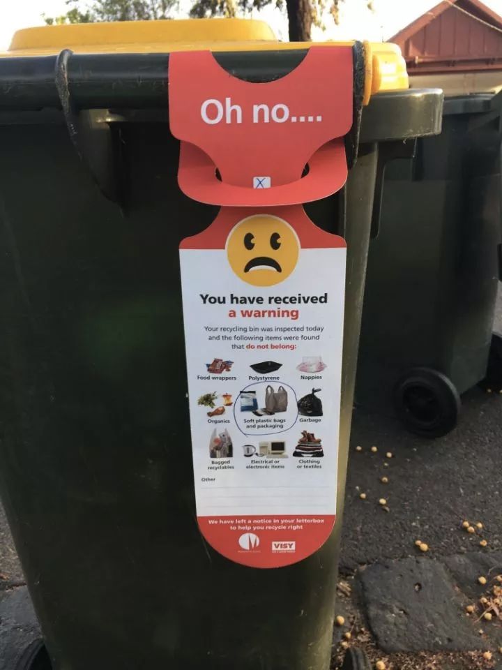受污染的垃圾箱将收到警告标签,表明垃圾箱中发现误分类垃圾。