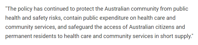 发言人还表示,“这项政策继续保护澳大利亚社区免受公共健康和安全风险的影响,控制公共医疗保健和社区服务方面的支出,并保障澳大利亚公民和永久居民获得供不应求的医疗保健和社区服务。”