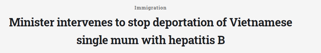 澳洲政府给出的理由却是,尽管身体健康且不再需要药物治疗,但作为乙肝患者,她潜在的健康治疗费用被认为对澳大利亚纳税人来说负担太大。