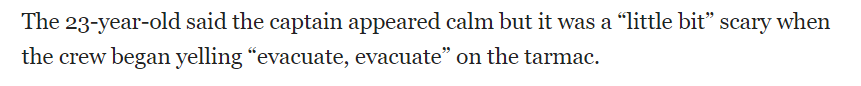 23岁的Rahman表示,当时机长看起来还是比较冷静,但机组人员在停机坪上大喊“撤离,撤离”时,他觉得开始有点吓人了。