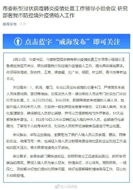 山东威海要求,从2月25日起,对从日本、韩国等国家来威海的入境人员,包括外籍人员和中方人员,全部统一接到宾馆免费集中居住,实行单人单间,14天后解除集中居住。