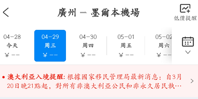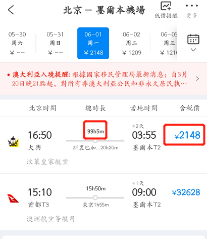 购票平台上显示已经有了往返中澳的航班,不光是广州,北京、上海等多地都已经有了往返澳洲的航班。