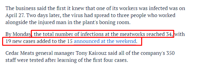 病毒传染迅速,一周后,34名在肉厂上班的工人确诊。