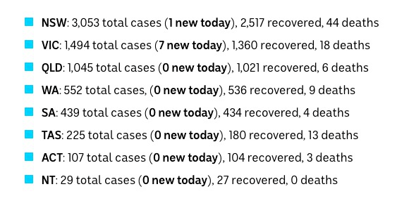 截至目前,全州累计确诊6948例,其中新州3053例,维州1496例,昆州1045例,南澳439例,西澳552例,塔州227例,首都领地107例,北领地29例。